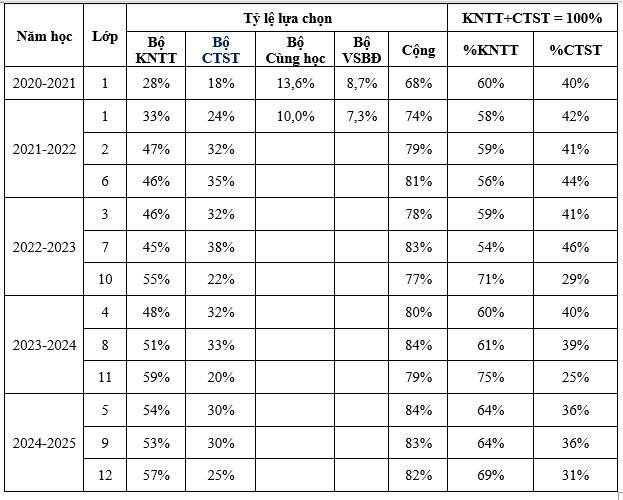 Trên cơ sở nghiên cứu các bộ SGK hiện hành và đối chiếu với các tiêu chí lựa chọn, Bộ GDĐT xác định: Bộ SGK "Kết nối tri thức với cuộc sống" đáp ứng đầy đủ và nổi trội hơn cả, cụ thể như sau: Bảo đảm đầy đủ, đồng bộ tất cả các môn học, hoạt động giáo dục ở cả 3 cấp học; chất lượng khoa học – sư phạm được khẳng định qua thực tiễn, được sử dụng rộng rãi tại tất cả 34 tỉnh/thành, với quy mô học sinh lớn nhất trong các bộ SGK hiện hành; tính ổn định, khả năng chỉnh lý và mức độ sẵn sàng cao nhất (Nhà xuất bản Giáo dục Việt Nam có đủ năng lực kỹ thuật, kho vận, phân phối, đảm bảo cung ứng trên phạm vi toàn quốc); hạn chế tối đa tác động đến giáo viên – học sinh – phụ huynh do đây là bộ sách đang được sử dụng ổn định và phổ biến nhất, giáo viên quen thuộc phương pháp, cấu trúc bài học.