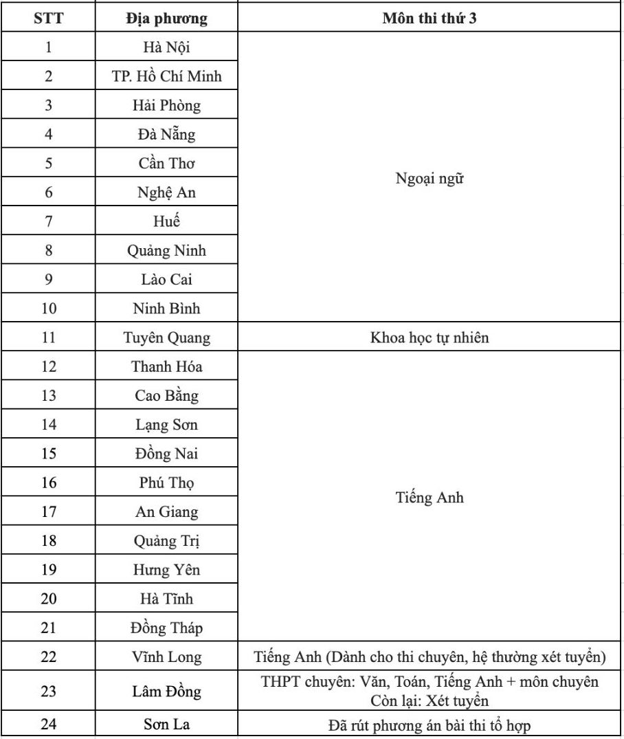 Trước đó, các địa phương như TP.HCM, Đồng Nai, Đà Nẵng, Huế, Nghệ An, Thanh Hóa, Hải Phòng, Cần Thơ, Lào Cai, Cao Bằng, Quảng Ninh, Lạng Sơn, Đồng Tháp… đều chọn môn thi thứ ba là Ngoại ngữ hoặc Tiếng Anh.