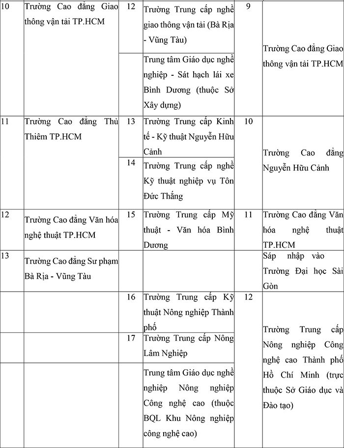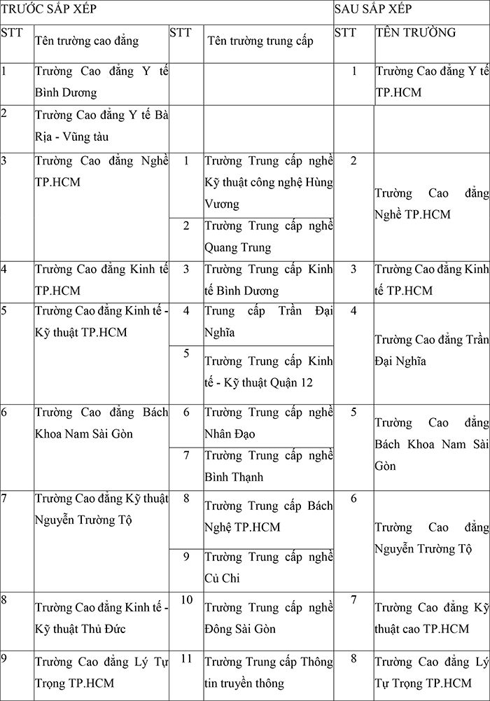 Giữ nguyên 6 trường: Cao đẳng Việt Nam - Singapore; Cao đẳng Việt Nam - Hàn Quốc Bình Dương; Kỹ thuật công nghệ Bà Rịa - Vũng Tàu; Công nghệ Thủ Đức; Kiến trúc - Xây dựng TPHCM; Bán công Công nghệ và Quản trị doanh nghiệp.
