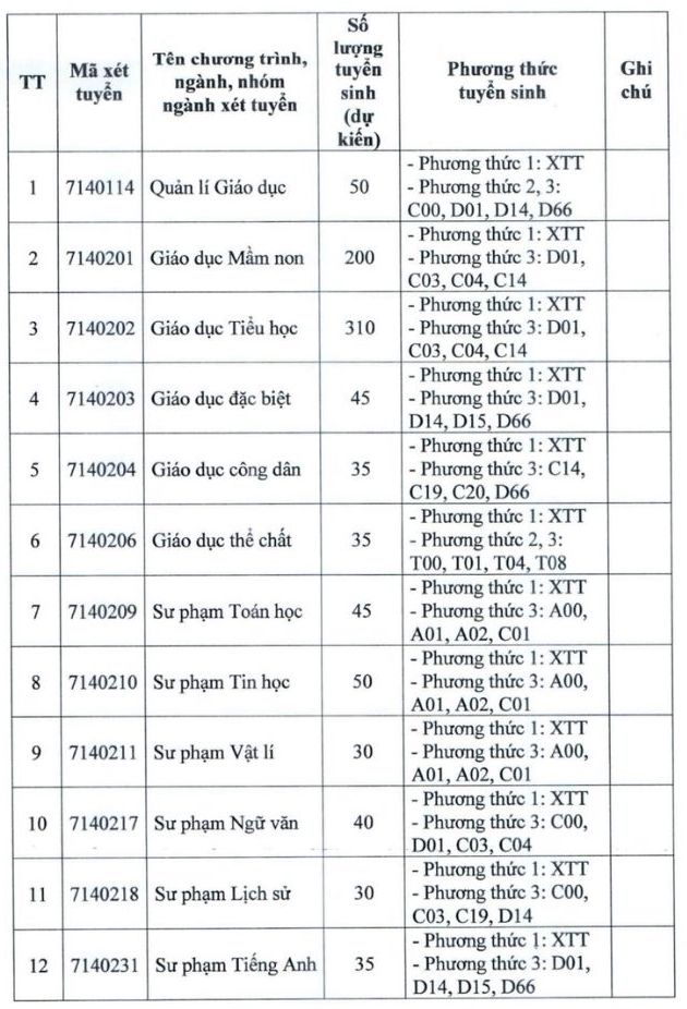 Về chỉ tiêu tuyển sinh, nhà trường dự kiến tuyển 200 chỉ tiêu ngành Giáo dục mầm non, 310 chỉ tiêu ngành Giáo dục Tiểu học, 45 chỉ tiêu ngành Sư phạm Toán học, 50 chỉ tiêu ngành Sư phạm Tin học, 30 chỉ tiêu ngành Sư phạm Vật lí, 40 chỉ tiêu ngành Sư phạm Ngữ văn, 30 chỉ tiêu ngành Sư phạm Lịch sử...