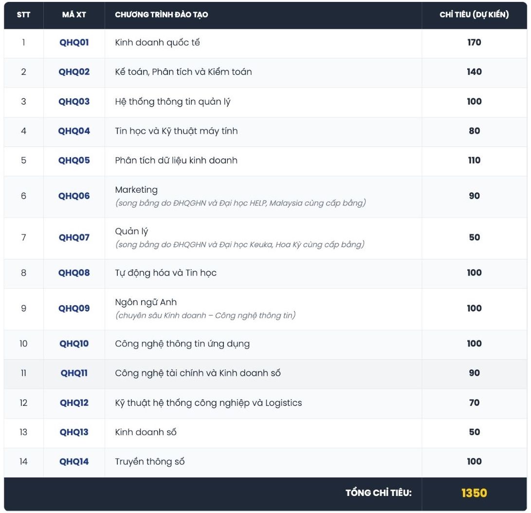 Về chỉ tiêu tuyển sinh, nhà trường dự kiến tuyển 170 chỉ tiêu ngành Kinh doanh quốc tế, 100 chỉ tiêu ngành Hệ thống thông tin quản lý, 80 chỉ tiêu ngành Tin học và Kỹ thuật máy tính, 70 chỉ tiêu ngành Kỹ thuật hệ thống công nghiệp và Logistics, 50 chỉ tiêu ngành Kinh doanh số... Cụ thể như sau: