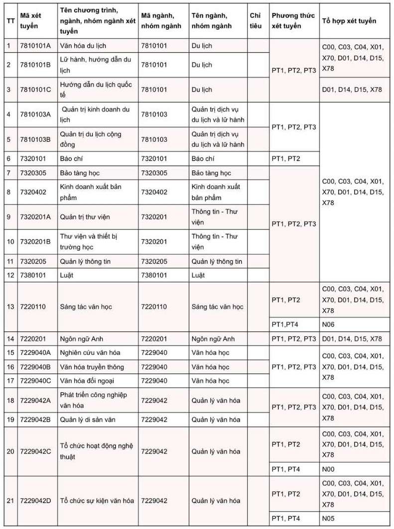 Danh sách tổ hợp môn xét tuyển được Trường Đại học Văn hóa Hà Nội sử dụng trong mùa tuyển sinh 2026 như sau: C00, C03, C04, D01, D14, D15...