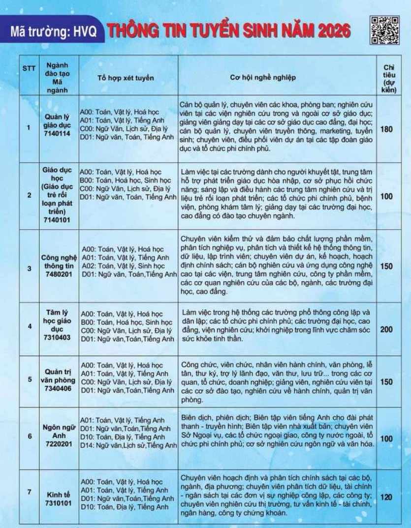 Học viện Quản lý Giáo dục vừa công bố thông tin tuyển sinh đại học chính quy năm 2026. Năm nay, học viện dự kiến tuyển sinh 1.000 chỉ tiêu cho 7 ngành, chương trình đào tạo, áp dụng 4 phương thức xét tuyển, gồm: