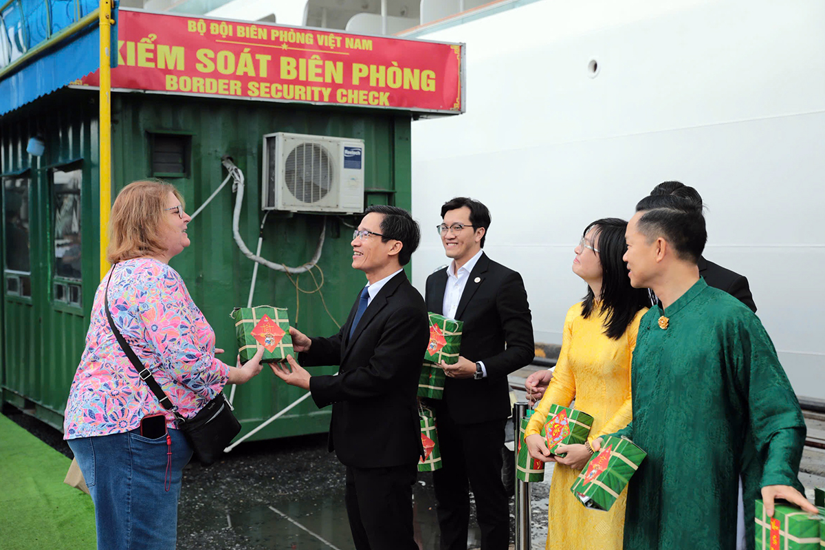 Chuyến tàu mang theo 580 du khách đến từ Anh, Pháp, Mỹ cùng khoảng 500 thuyền viên. Ngay khi cập cảng, đoàn khách được chào đón bằng múa lân, nón lá và những hộp quà Tết với bánh chưng, bánh tét đậm văn hóa Việt.