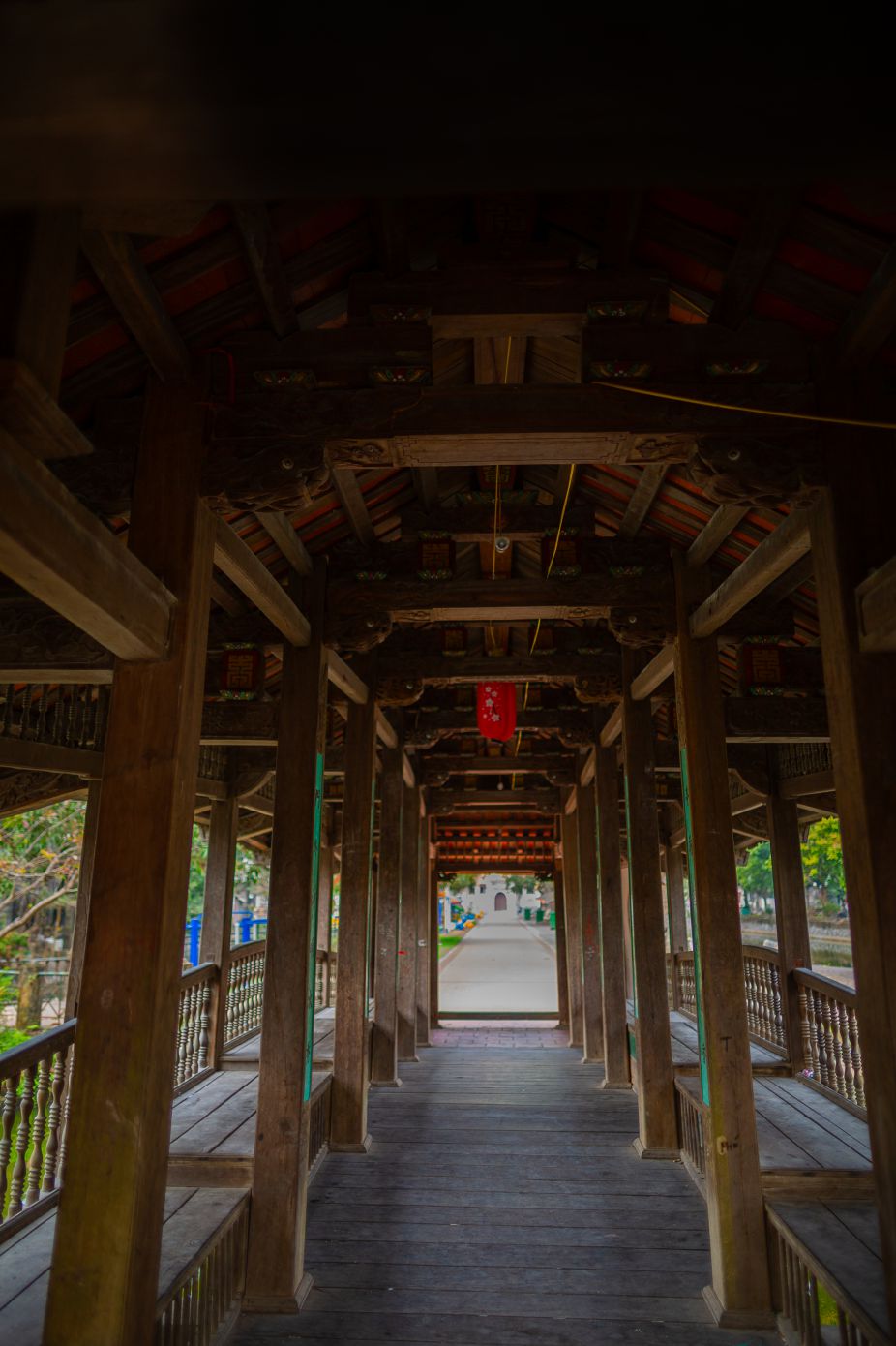 Hai bên sàn cầu là hành lang gỗ với chỗ nghỉ chân, nơi người dân dừng lại ngắm ao làng, chuyện trò sau những ngày mùa bận rộn. Hàng muỗm cổ thụ hàng trăm năm tuổi tỏa bóng mát quanh năm, tạo nên không gian trong lành, yên bình hiếm có giữa vùng ven đô Hà Nội.