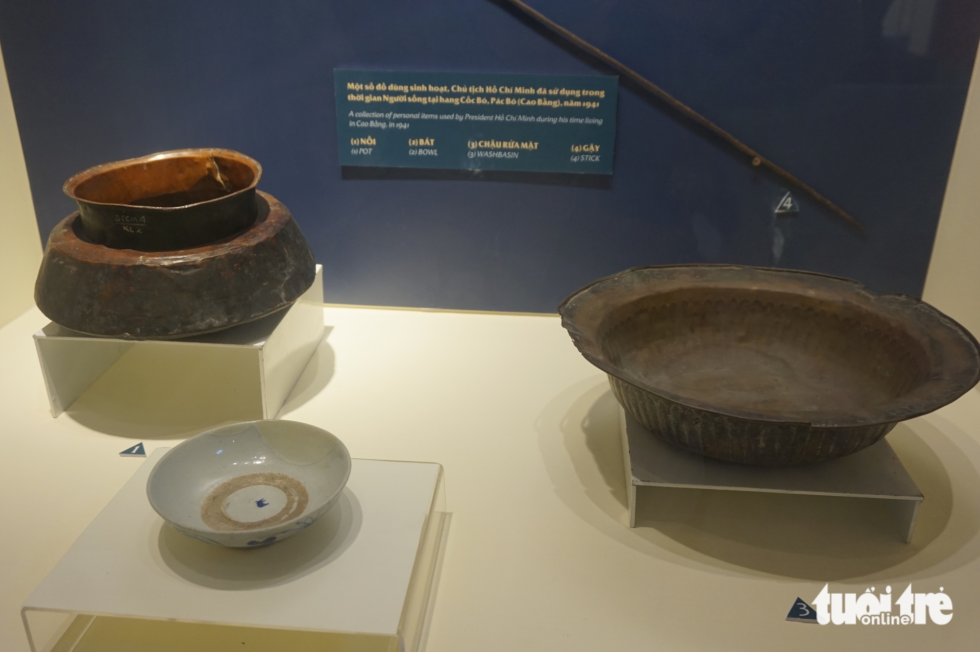 Những vật dụng giản dị như nồi, bát, chậu, gậy… khiến người xem xúc động về lối sống giản dị, tinh thần làm việc bền bỉ của Người trong hoàn cảnh gian khó.