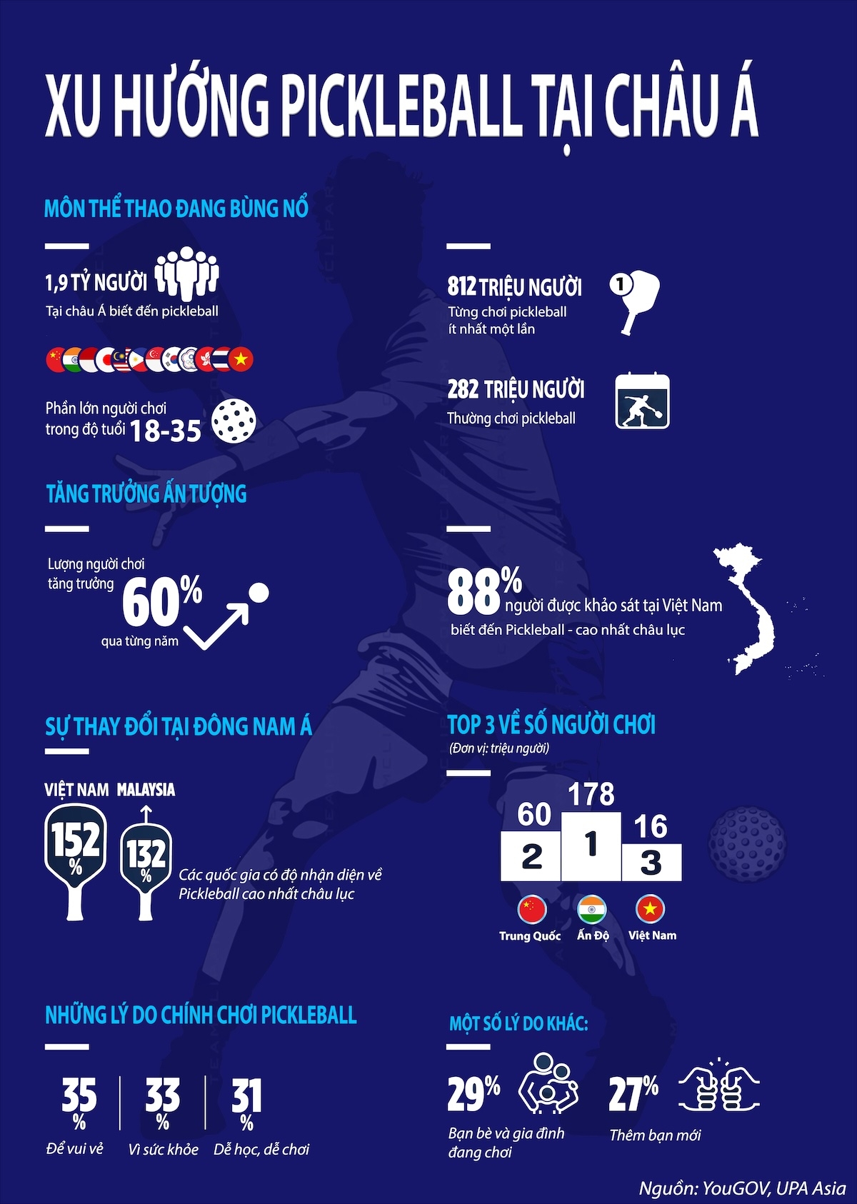 Báo cáo tháng 10/2025 của UPA Asia & YouGov ước tính Việt Nam hiện có 16 triệu người chơi, xếp thứ ba châu Á, sau Ấn Độ và Trung Quốc. Trong đó, 28% người chơi chuyển dịch từ các môn vợt truyền thống như tennis, cầu lông, bóng bàn. Sự tăng trưởng "mức độ nhận biết về pickleball" ở Việt Nam trong giai đoạn 2024-2025 xếp hàng đầu châu Á (152%).