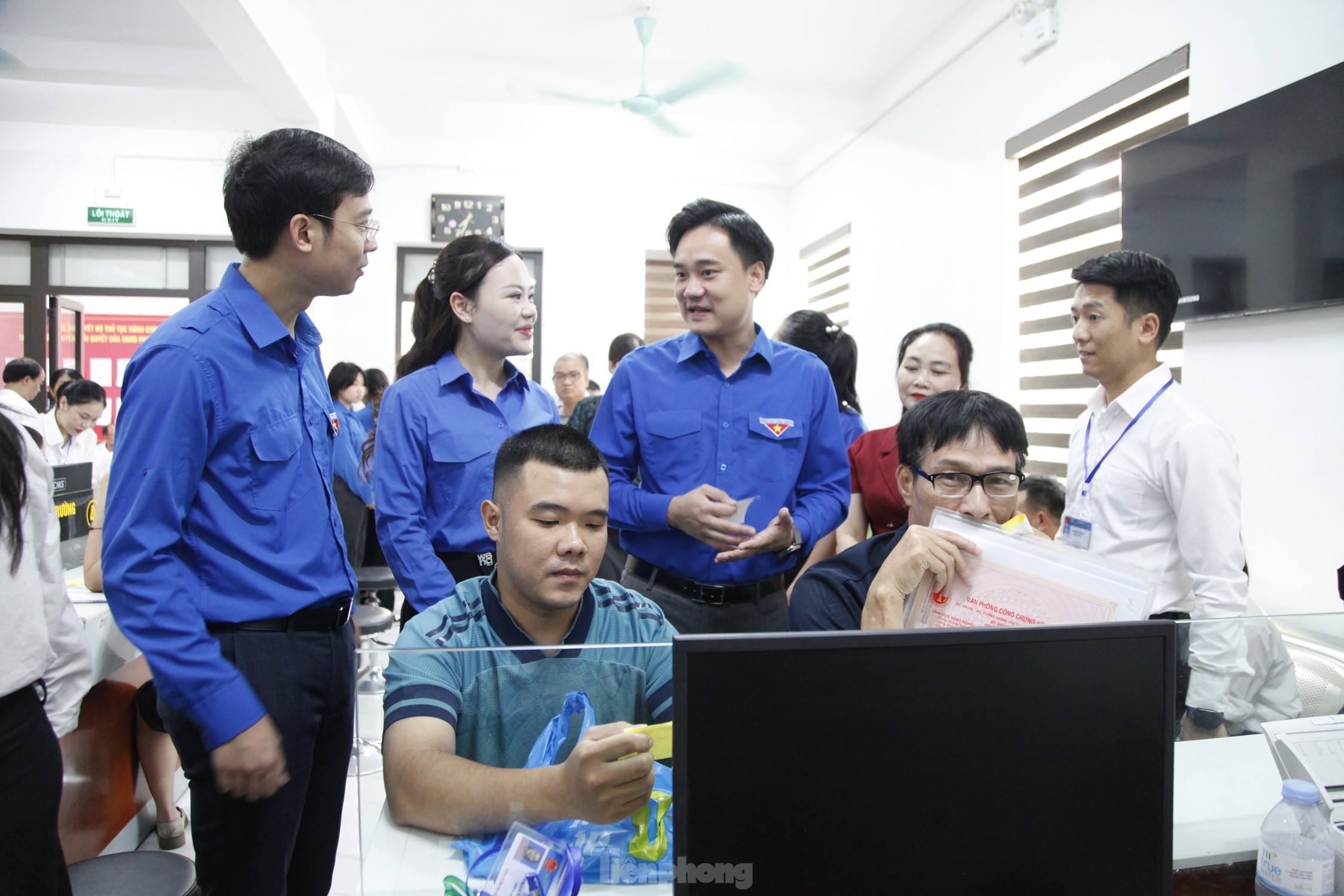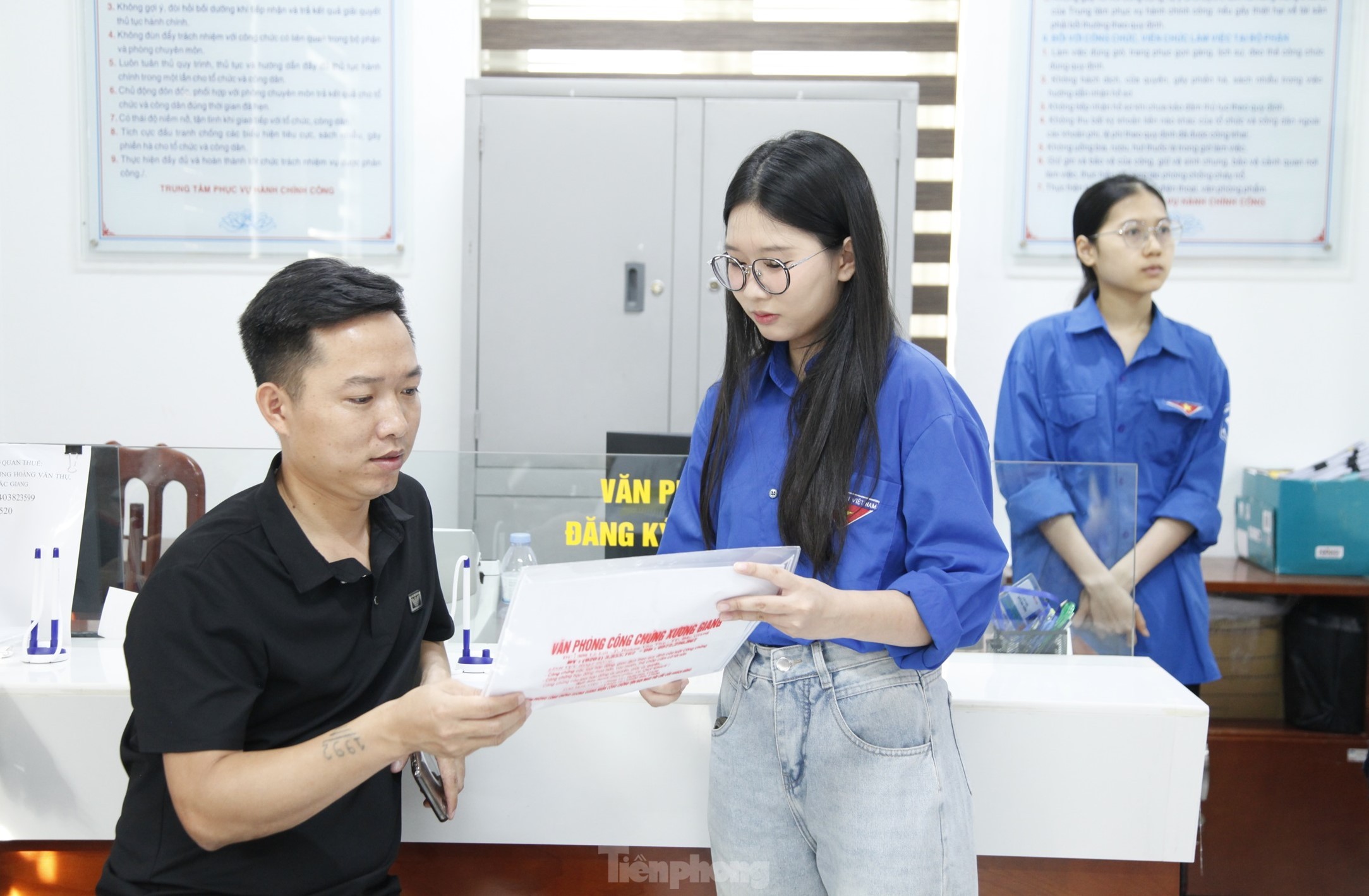 Đầu giờ sáng 7/7, tại Trung tâm Phục vụ hành chính công phường Bắc Giang (tỉnh Bắc Ninh), các đoàn viên trong đội hình tình nguyện đã có mặt từ sớm để hỗ trợ người dân làm thủ tục hành chính. Các đoàn viên giúp người dân lấy số thứ tự, hỗ trợ sử dụng các phần mềm giải quyết thủ tục hành chính.