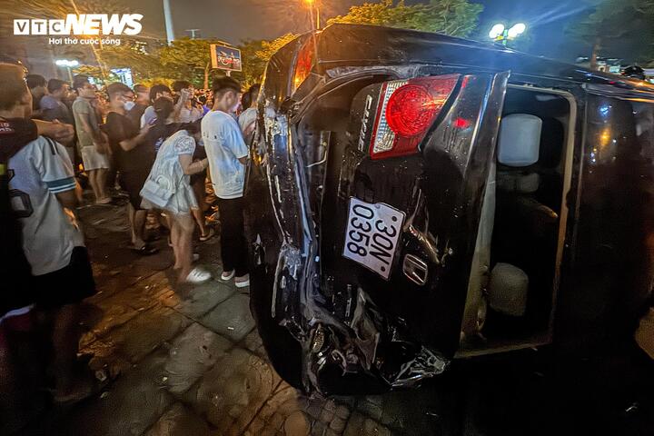 Cú va chạm mạnh khiến nhiều xe máy bị hất tung, nằm la liệt trên mặt đường. Một chiếc ô tô con bị hất văng, lật nghiêng trên vỉa hè, mảnh vỡ xe máy vương vãi khắp nơi.