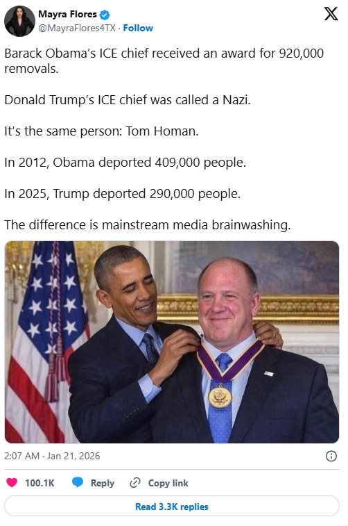 Tháng 1, mạng xã hội Facebook và X xuất hiện các bài đăng lan truyền thông tin ông Homan từng giữ chức "Giám đốc ICE" dưới thời ông Obama, và nhận được huân chương nhờ lập kỷ lục về số lượng người bị trục xuất khỏi Mỹ.
