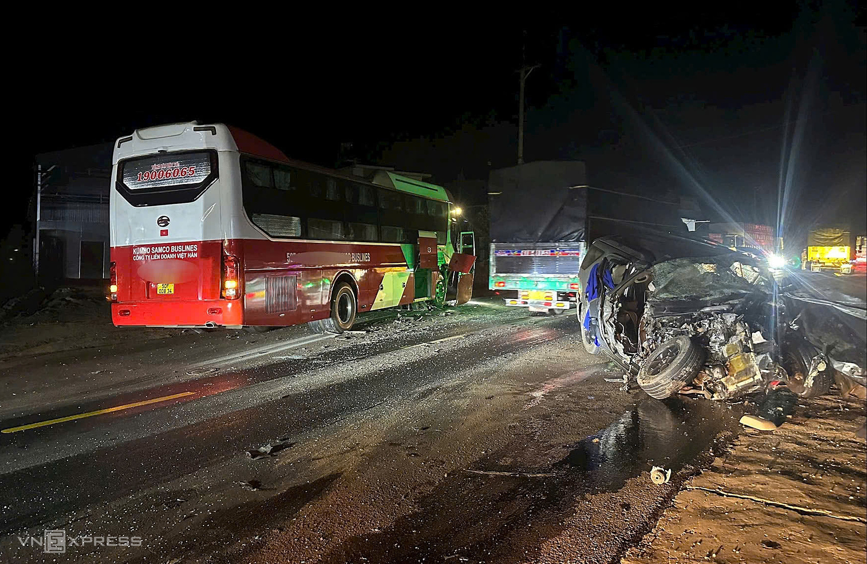 Cú tông mạnh khiến ôtô 7 chỗ biến dạng, hai người ngồi sau tử vong tại chỗ, ông Quảng bị thương được đưa tới Bệnh viện Đăk Nông cấp cứu. Hai xe hư hỏng nặng.