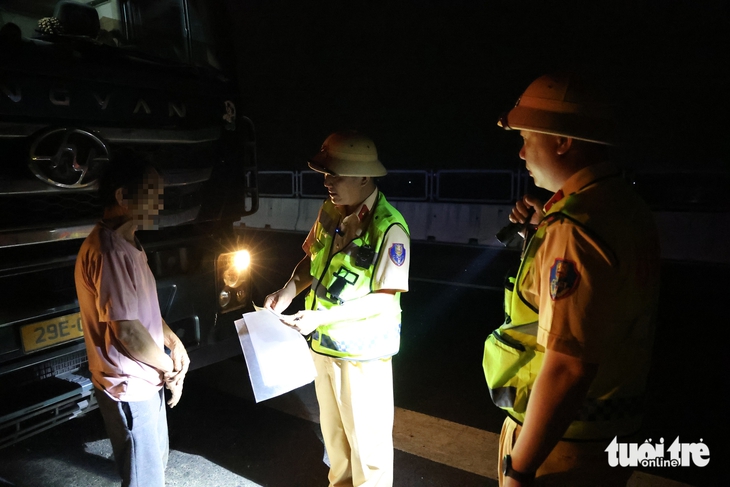 Đến 21h25, tổ tuần tra cũng phát hiện xe container dừng tại dải dừng khẩn cấp gần nút giao Ma Lâm. Sau vài tiếng gõ cửa cabin, tài xế Trần Văn Soái (63 tuổi, ngụ TP Hà Nội) tỉnh dậy phân trần: "Mệt quá nên tấp vào ngủ một chút".