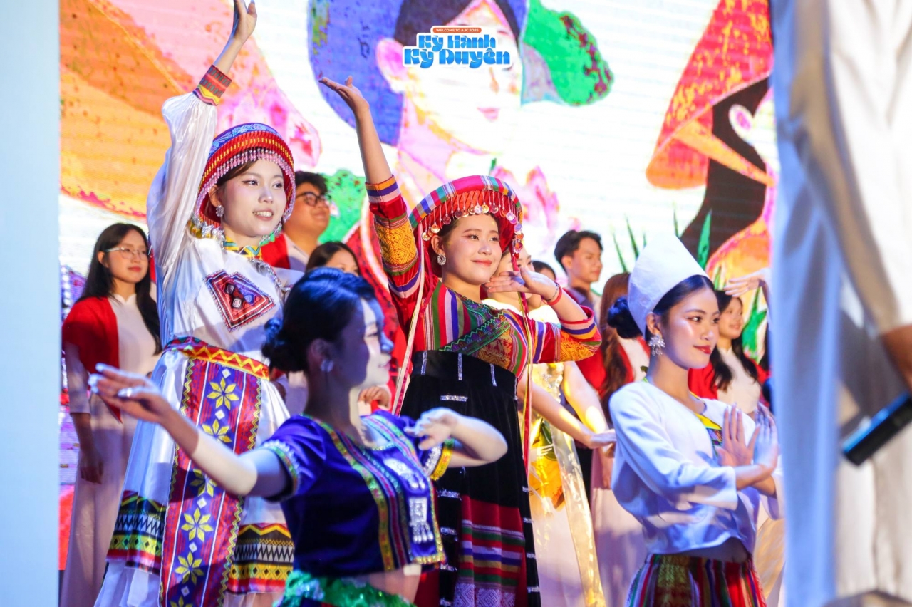 Đắm chìm trong không gian của âm nhạc và ánh sáng, các tân sinh viên thưởng thức nhiều tiết mục ấn tượng với đa dạng phong cách thể hiện như điệu múa Thuận nước đẩy thuyền, nhảy Bản đồng dao hay hợp ca Trống cơm.