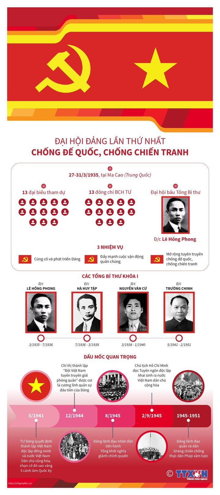 Đại hội lần thứ I của Đảng diễn ra từ ngày 27 đến 31/3/1935, tại Macau, Trung Quốc, với sự tham gia của 13 đại biểu thuộc các đảng bộ trong nước và tổ chức của Đảng hoạt động ở nước ngoài, do đồng chí Hà Huy Tập chủ trì.
