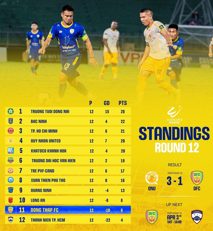 CLB Đồng Tháp đang xếp áp chót giải hạng nhất và chỉ hơn đội cuối bảng 2 điểm. Ở vòng 13, họ sẽ tiếp chính Thanh Niên TP.HCM trong trận chung kết ngược của mùa giải.