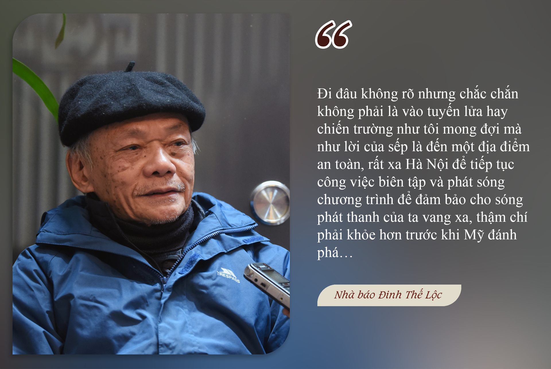 “Đi đâu không rõ nhưng chắc chắn không phải là vào tuyến lửa hay chiến trường như tôi mong đợi mà như lời của sếp là đến một địa điểm an toàn, rất xa Hà Nội để tiếp tục công việc biên tập và phát sóng chương trình để đảm bảo cho sóng phát thanh của ta vang xa, thậm chí phải khỏe hơn trước khi Mỹ đánh phá…”, nhà báo Đinh Thế Lộc nhớ lại.