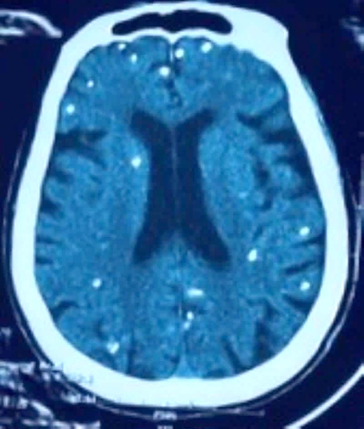 Người bệnh được chẩn đoán nhiễm ấu trùng sán dây lợn. Hình ảnh cắt lớp vi tính sọ não và X-quang ngực cho thấy rất nhiều nốt cản quang trong nhu mô não và dưới da vùng ngực - bụng.