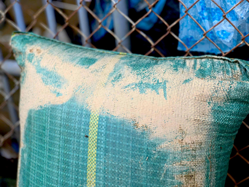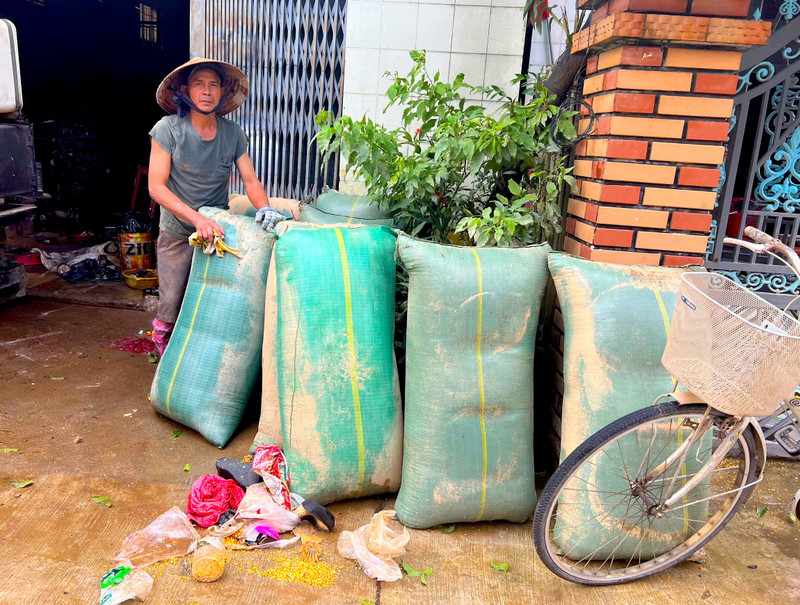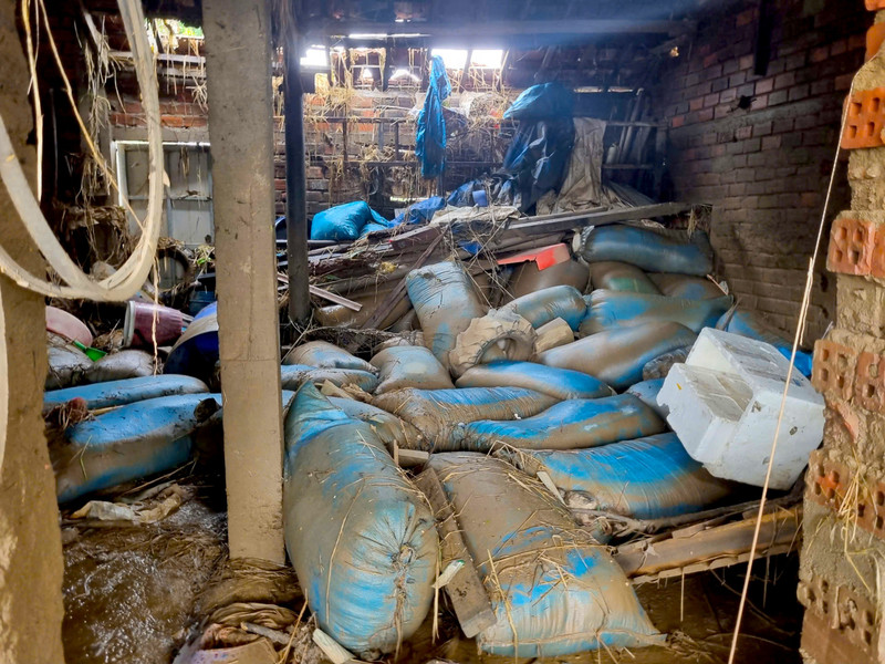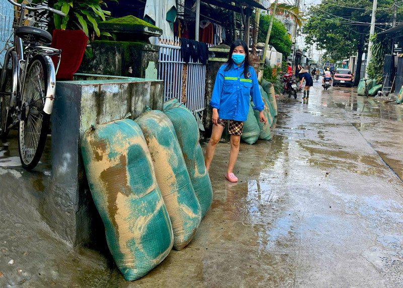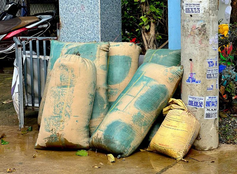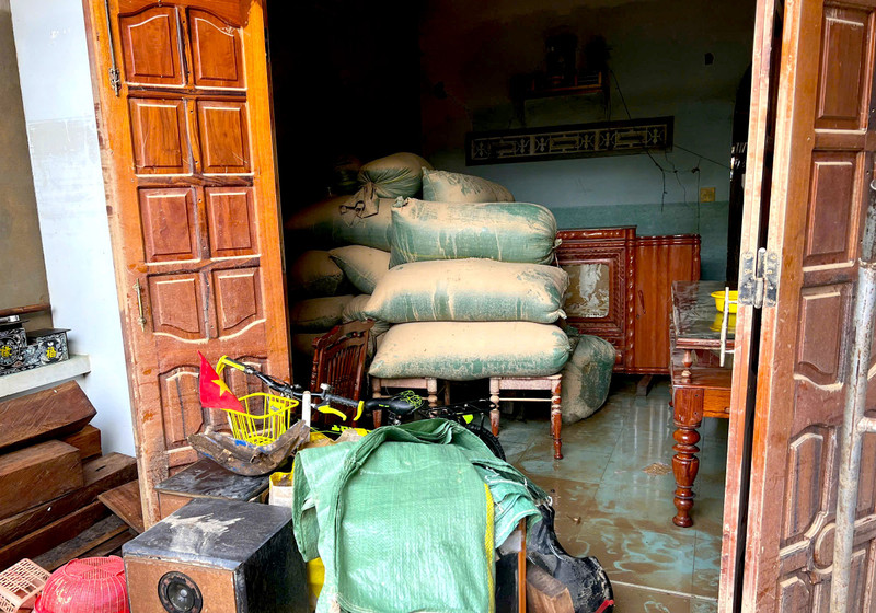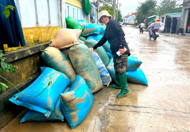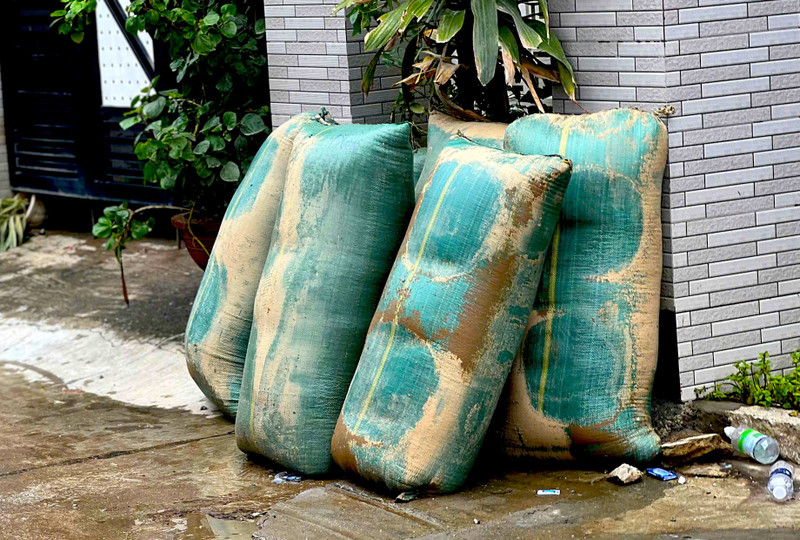 Người dân phường Đông Hòa để những bao thóc bị ngập nước ra ngoài cửa vì không biết xử lý thế nào.