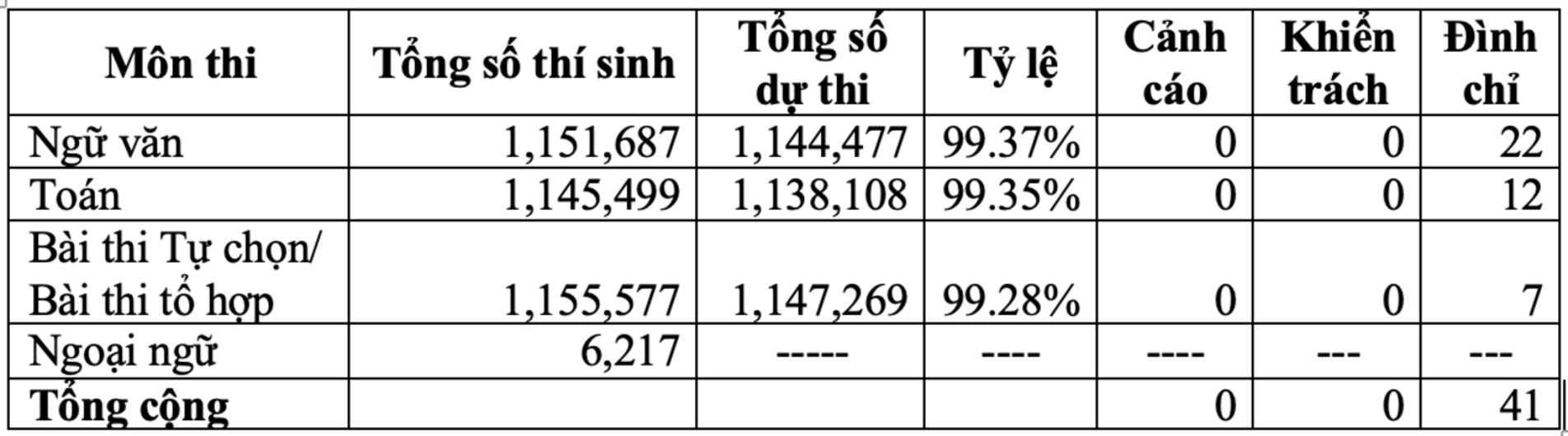Trong đó, môn Ngữ văn có 22 thí sinh vi phạm, tiếp theo là môn Toán với 12 thí sinh vi phạm. Bài thi tự chọn/bài thi tổ hợp ghi nhận 7 thí sinh bị đình chỉ thi do sử dụng tài liệu và mang điện thoại vào phòng thi. Không ghi nhận cán bộ nào vi phạm quy chế thi.Năm 2024 có 30 thí sinh vi phạm quy chế thi, gồm 3 trường hợp bị khiển trách, 1 trường hợp bị cảnh cáo, 26 thí sinh bị đình chỉ.