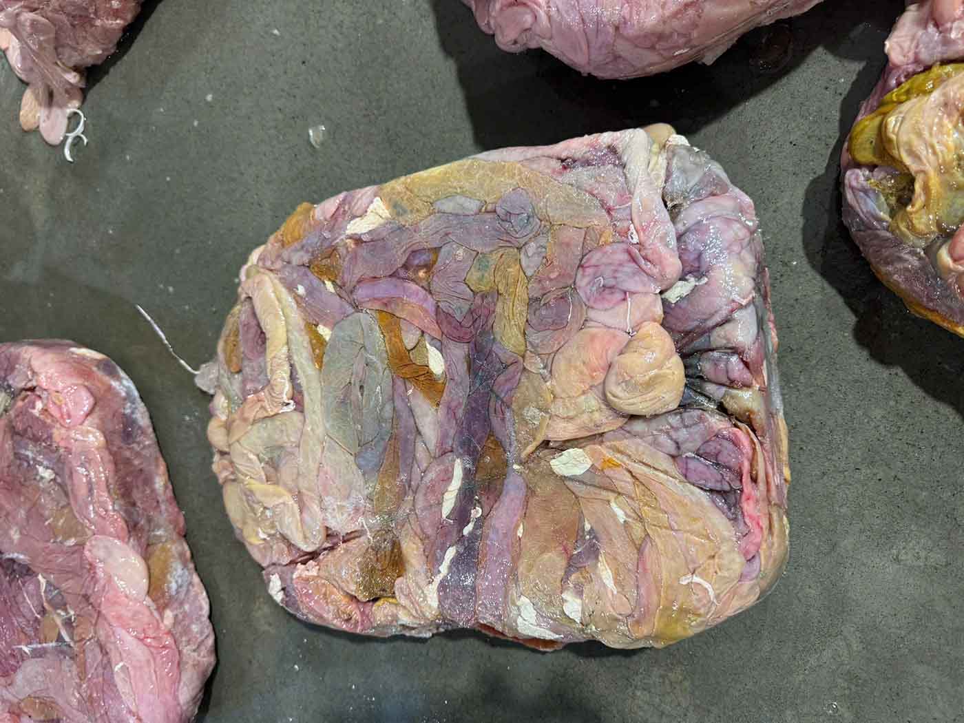 Qua kiểm tra kho lạnh, lực lượng chức năng ghi nhận: Khoảng 59 tấn lòng nguyên liệu được cấp đông trong 3 container từ 4-6 tháng; 1 tấn lòng đang trong quá trình sơ chế; 3,6 tấn lòng thành phẩm.