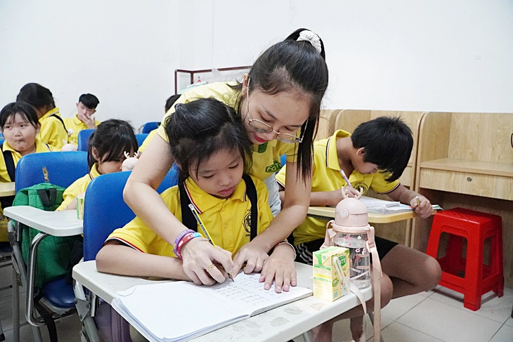 Trong lớp, chị phụ trách kèm các em học môn toán và tiếng Việt. Em nào không tập trung, chị cầm tay chỉ từng nét chữ, rồi kiên nhẫn sửa lỗi sai và không quên khen ngợi để các em tự tin hơn. "Mỗi ngày các em tiến bộ một chút thôi là tôi mừng lắm", chị chia sẻ.