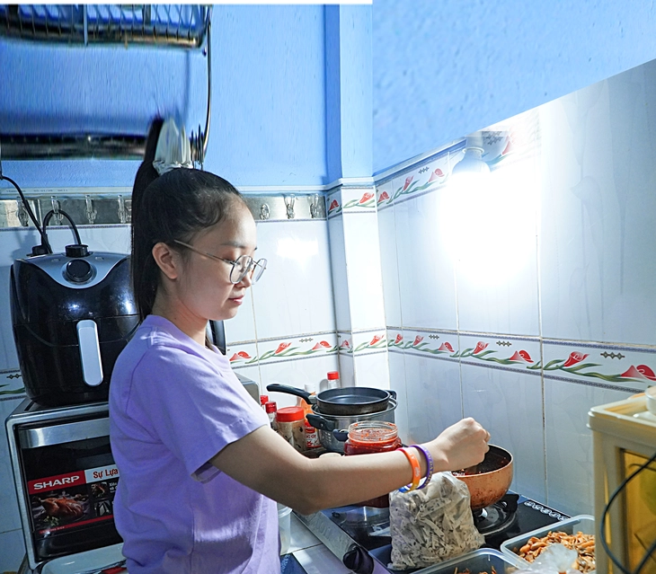 4h sáng, chuông báo thức vừa reo lên, căn trọ nhỏ của chị Huệ đã sáng đèn. Chị bắt tay ngay vào từng công đoạn quen thuộc, cẩn thận làm nóng chả chay, rim sườn chay, nấu nước sốt. Sau đó, là công đoạn nhặt ngò và thái dưa leo, chia nhân và đóng gói xốt cho buổi phát bánh. Chị làm sạch sẽ, nhanh gọn một lúc là đã xong phần nhân cho khoảng 200 ổ bánh mì.
