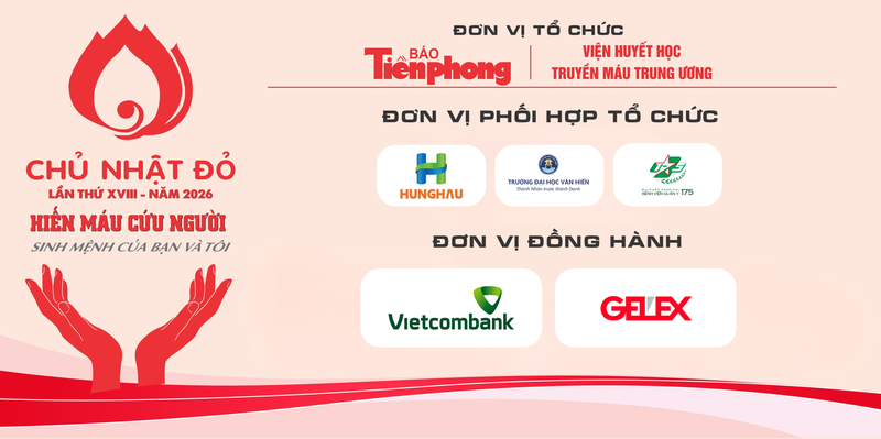 Ngày hội Chủ Nhật Đỏ 2026 tại TPHCM do Báo Tiền Phong và Viện Huyết học - Truyền máu Trung ương tổ chức, phối hợp cùng ĐH Văn Hiến, Bệnh viện Quân y 175 và các đơn vị đồng hành như Ngân hàng Thương mại Cổ phần Ngoại thương Việt Nam, Tập đoàn Gelex.