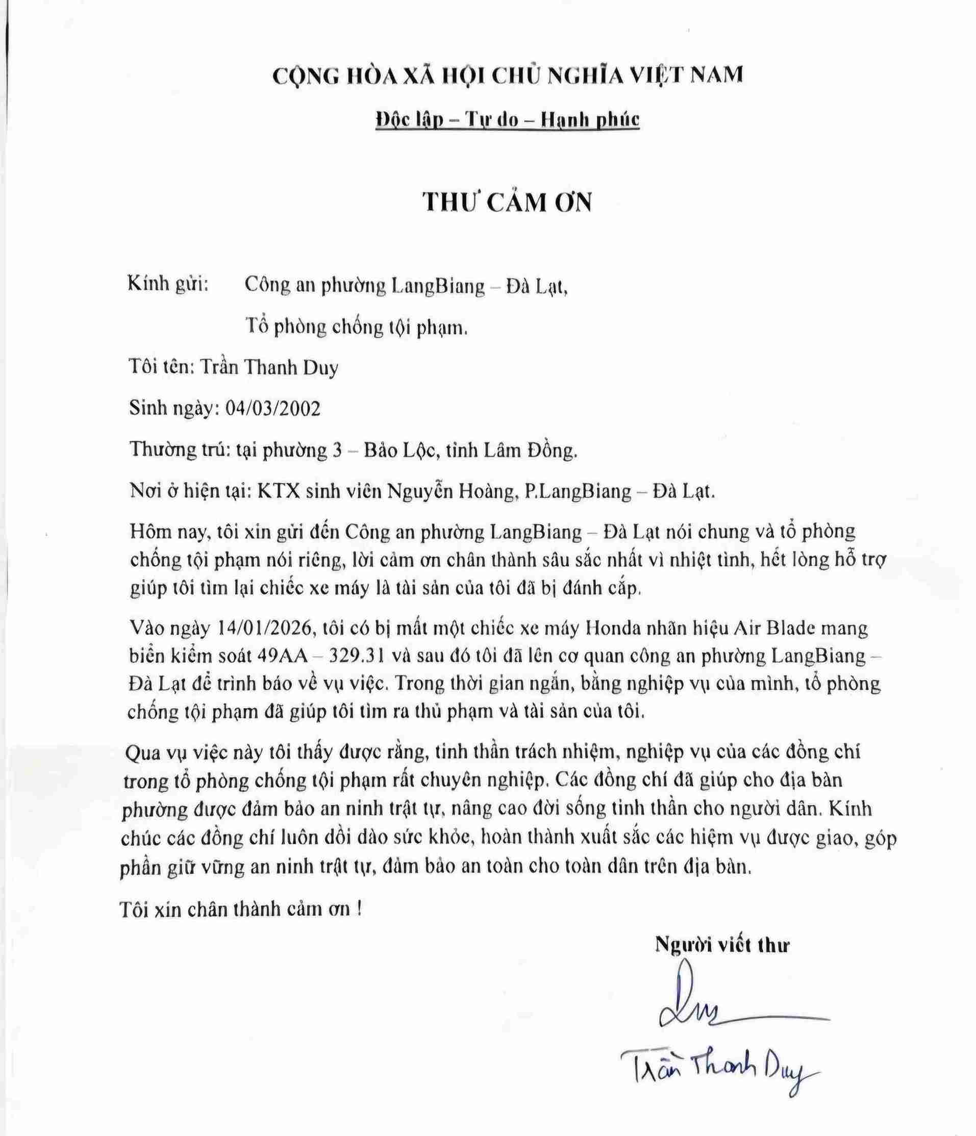 Sau khi nhận lại xe máy bị trộm, anh T.T.D đã gửi thư cảm ơn lực lượng Công an phường Lang Biang về tinh thần trách nhiệm trong bảo vệ tài sản, giữ gìn an ninh trật tự, cuộc sống bình yên cho người dân.