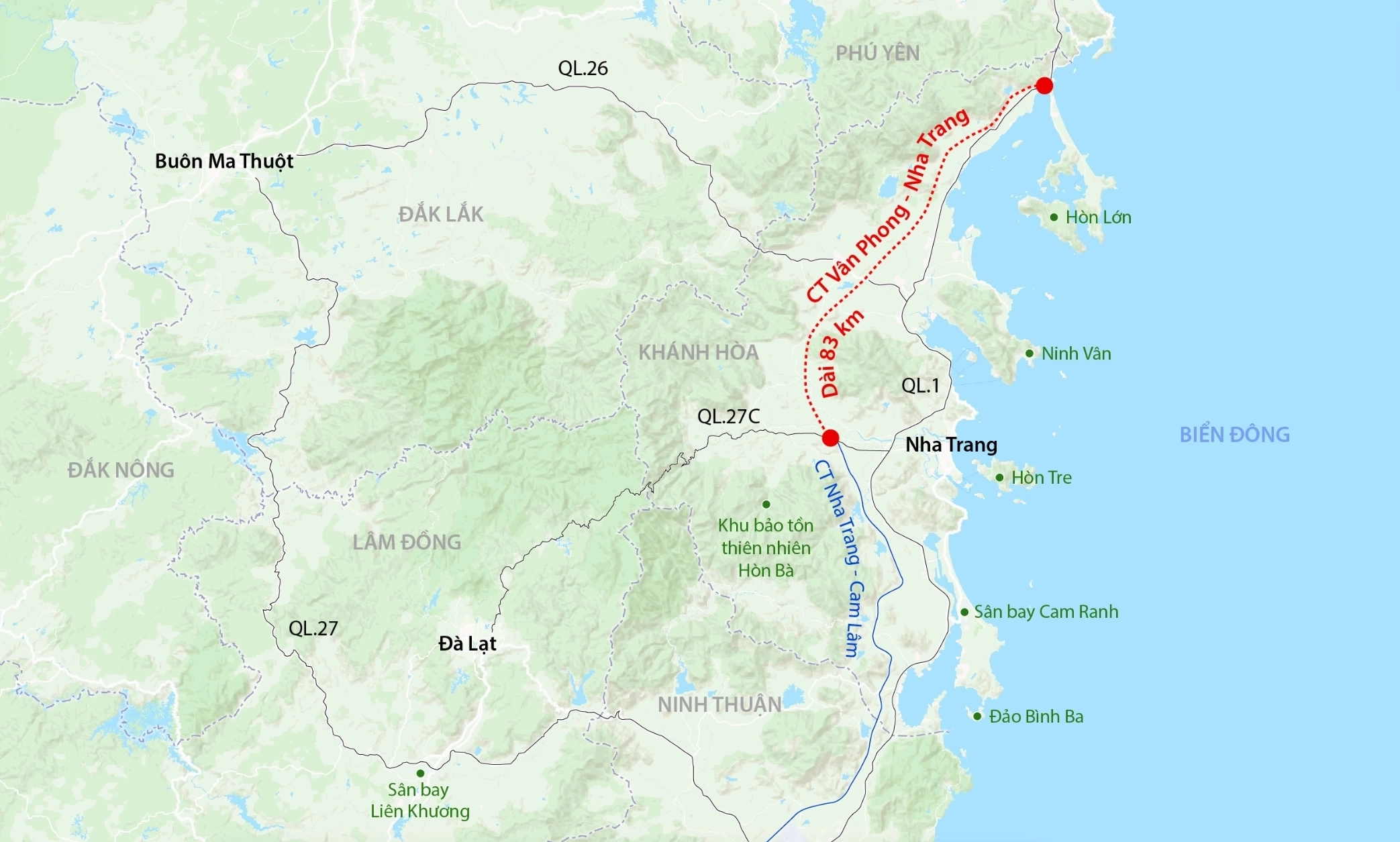 Cao tốc Vân Phong – Nha Trang dài 83 km, quy mô 4 làn xe, tổng vốn đầu tư gần 12.000 tỷ đồng, góp phần giảm tải quốc lộ 1 và kết nối trục cao tốc Bắc – Nam phía Đông.