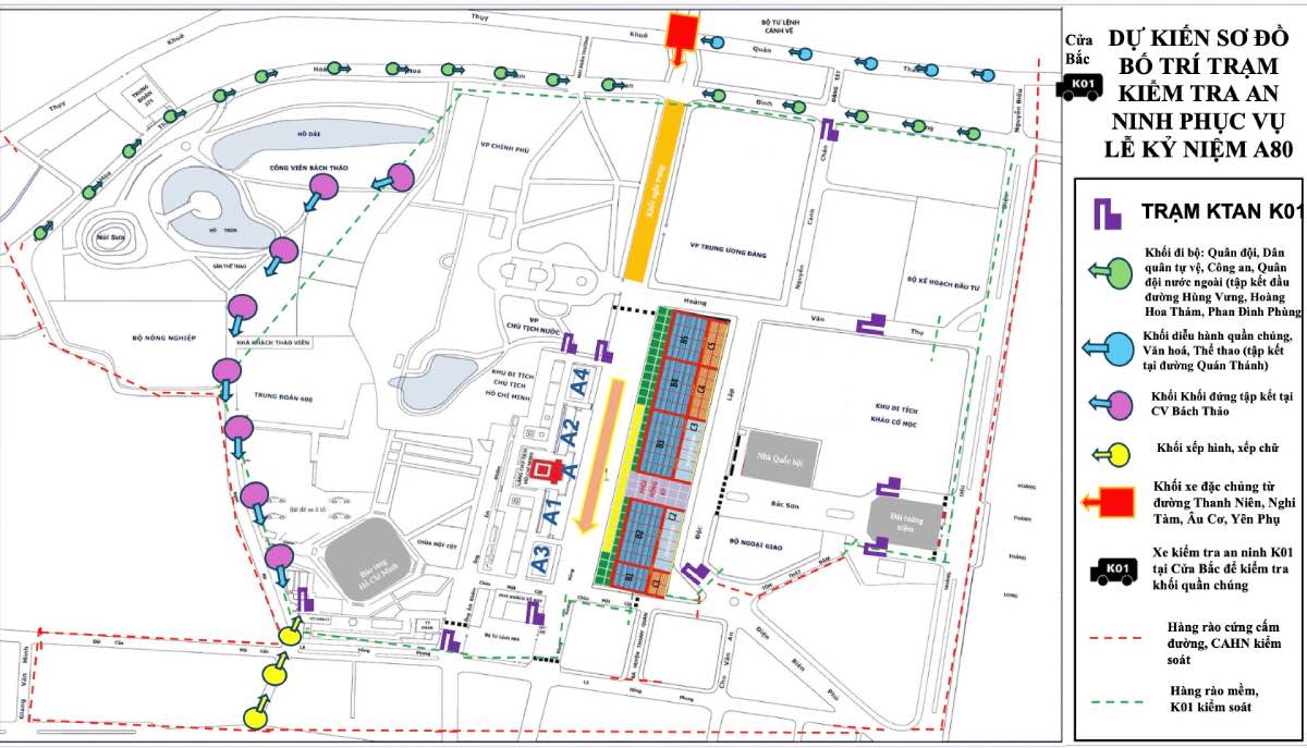 Để đảm bảo tuyệt đối an ninh, an toàn buổi Tổng duyệt và buổi Chính thức Lễ kỷ niệm 80 năm Cách mạng Tháng Tám và Quốc khánh 2.9, Bộ Tư lệnh Cảnh vệ - Phó trưởng Tiểu ban An ninh Lễ kỷ niệm thông báo sơ đồ bố trí trạm kiểm tra an ninh phục vụ Lễ kỷ niệm và quy định về việc sử dụng Giấy mời do Ban tổ chức phát hành.