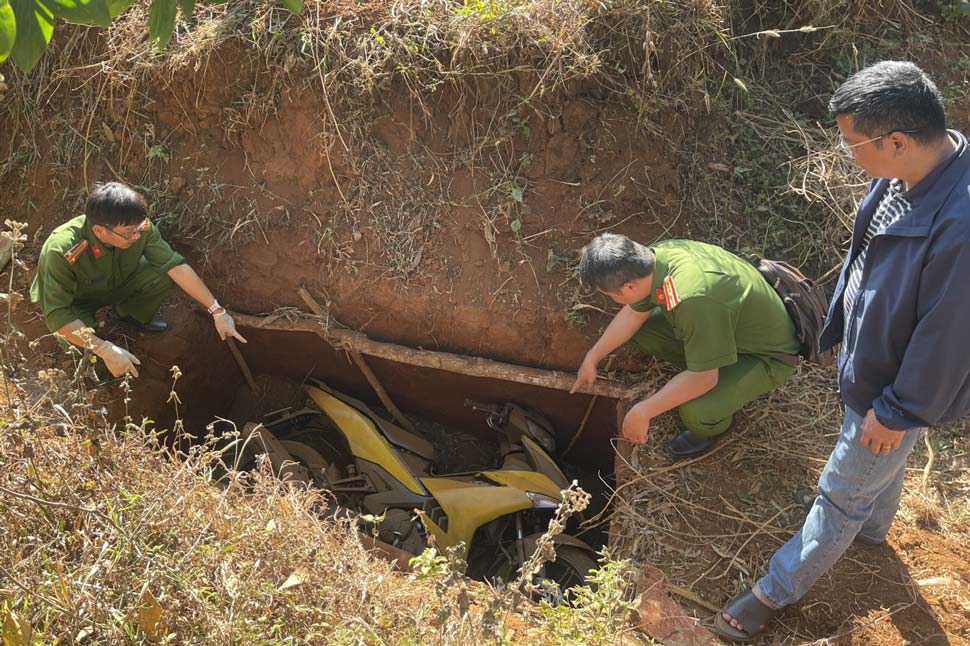 Chiếc xe máy được chôn trong hố có chiều dài khoảng 2m, sâu 1,15m, rộng 0,76m. Miệng hố được che bằng tấm ván gỗ, phủ bên trên một tấm chiếu nhựa và ngụy trang bằng lớp đất.