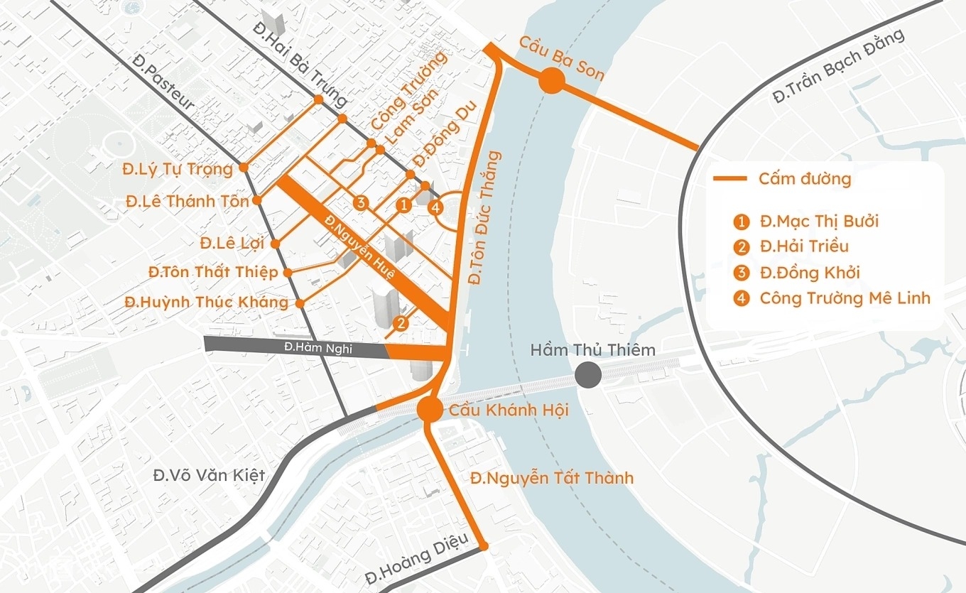 Nhằm đảm bảo an ninh trật tự, hạn chế ùn tắc do lượng lớn người dân đổ về trung tâm, TP HCM cấm toàn bộ xe vào nhiều tuyến đường trọng điểm như Lê Lợi (đoạn Pasteur - Đồng Khởi), Nguyễn Huệ (Lê Thánh Tôn - Tôn Đức Thắng), Đồng Khởi (Mạc Thị Bưởi - Tôn Đức Thắng), Tôn Đức Thắng (Lê Duẩn - cầu Khánh Hội).