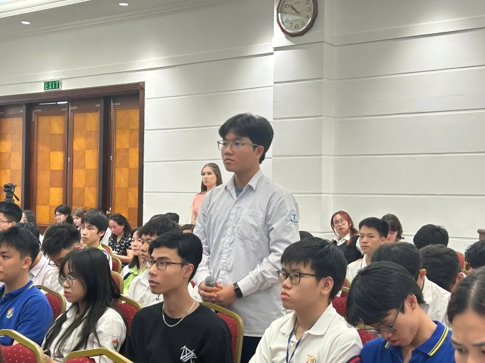 Học sinh đến từ các trường THPT trong phần giao lưu hỏi đáp với Trung tướng Phạm Tuân. (Ảnh: Yến Vi)