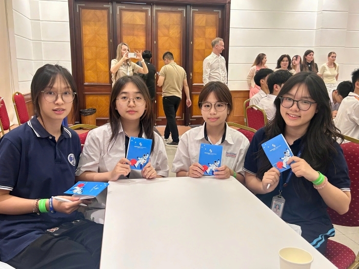 Gia Hân (ngoài cùng bên trái) cho biết, em cảm thấy thích thú khi được học tập, giao lưu với học sinh đến từ nhiều trường THPT khác, đặc biệt là các bạn người Nga đang học tại Việt Nam. (Ảnh: Yến Vi)