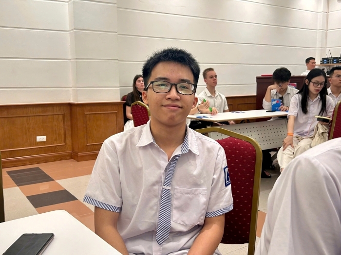 Hồ Trung Hiếu (Lớp 10 Tin 1, THPT Chuyên Hà Nội - Amsterdam) bày tỏ sự ấn tượng với câu chuyện do Trung tướng Phạm Tuân chia sẻ. (Ảnh: Yến Vi)
