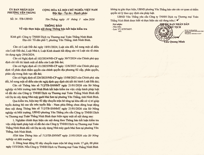 Đáng nói trước đó, vào ngày 10.3.2026, UBND phường Yên Thắng đã có văn bản Thông báo gửi Công ty Toàn Thắng Ninh Bình, yêu cầu doanh nghiệp này: Nghiêm chỉnh thực hiện các nội dung theo Thông báo kết luận kiểm tra việc chấp hành pháp luật về đất đai của Sở NNMT; Dừng hoạt động 2 dây chuyền trạm trộn bê tông trước 17h ngày 15.3.2026.