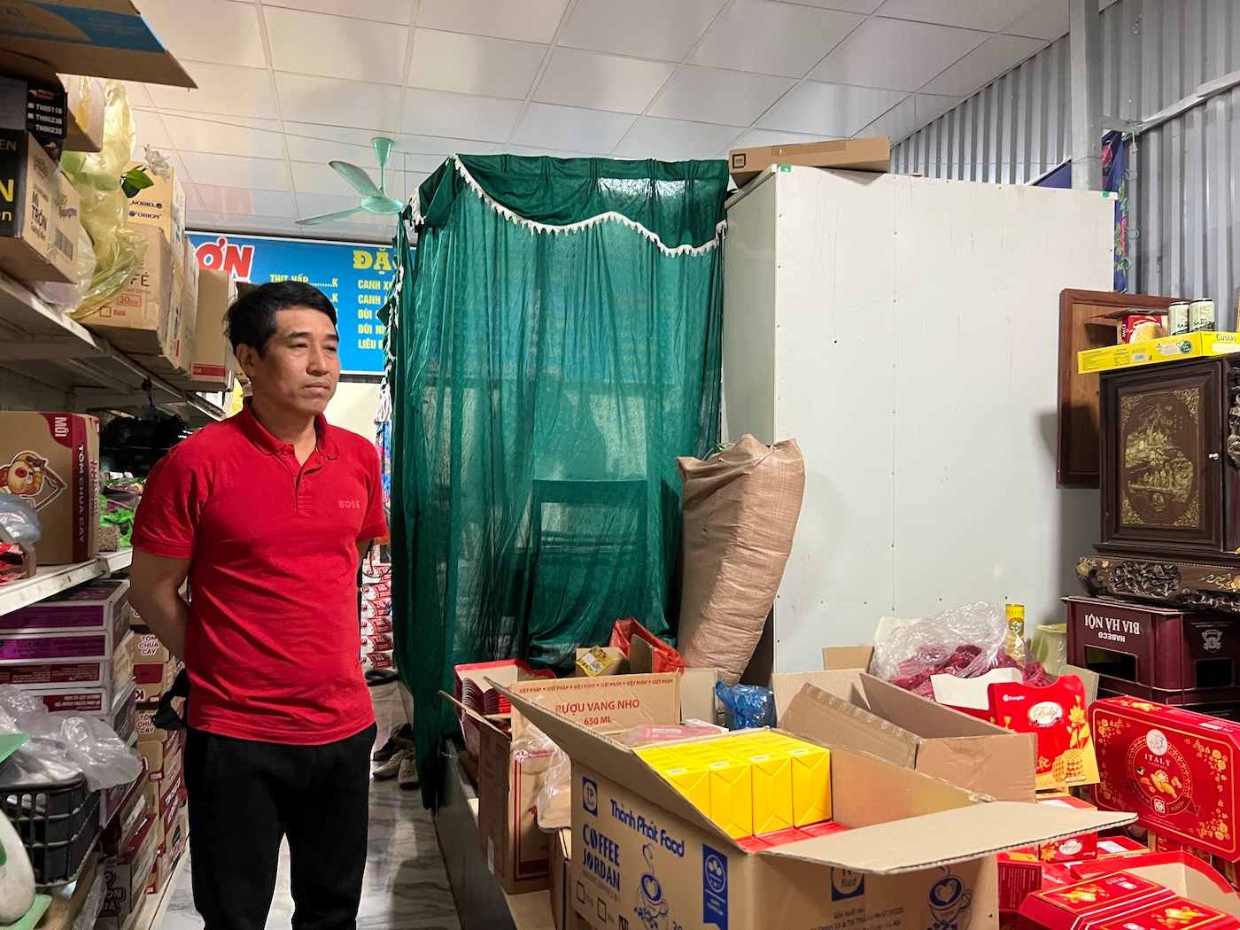 "Lên khu tạm cư, ngoài sự hỗ trợ của chính quyền địa phương, doanh nghiệp và các mạnh thường quân hỗ trợ một số nhu yếu phẩm như mì tôm, gạo, sữa, vợ chồng tôi cũng tự cải tạo lại chỗ ở cho phù hợp nên cuộc sống không đến mức quá khó khăn.