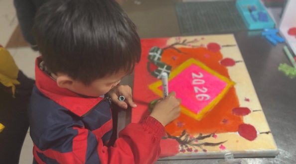 Con vẽ từ máy bay, ôtô, ngôi nhà, trường học, con suối… Từ khi chuyển đến khu tạm cư mới, lại đúng dịp Tết Nguyên đán Bính Ngọ 2026, con chuyển sang vẽ các bức tranh về ngày Tết.