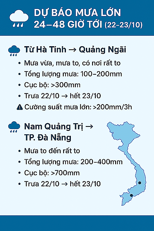 Do ảnh hưởng hoàn lưu bão kết hợp không khí lạnh, gió đông và hiệu ứng địa hình, từ trưa mai đến ngày 27/10, khu vực từ Hà Tĩnh đến Quảng Ngãi có mưa to, tập trung mạnh nhất từ chiều 22 đến hết 23/10. Lượng mưa Hà Tĩnh - bắc Quảng Trị và Quảng Ngãi 200-400 mm, có nơi hơn 500 mm. Nam Quảng Trị, TP Huế và Đà Nẵng mưa 500-700 mm, có nơi hơn 900 mm.