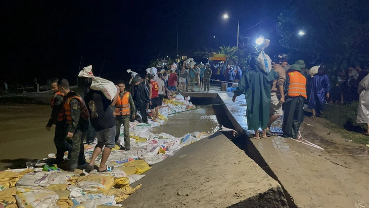 Ông Phạm Được, Chủ tịch UBND xã Duy Nghĩa, cho biết đêm 29-10 và tới sáng nay nhiều nhân lực vẫn tiếp tục được huy động để theo dõi, gia cố đoạn kè bê tông ở bến cá An Lương.