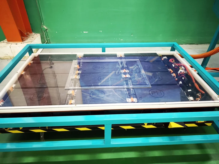 Về khối pin cao áp, đây thường là "vùng cấm" trên xe thật do điện áp cao, yêu cầu thao tác nghiêm ngặt. Trên mô hình, pin sử dụng LiFePO4, đặt trong hộp kim loại có nắp mica trong suốt để quan sát bên trong cho người học quan sát.