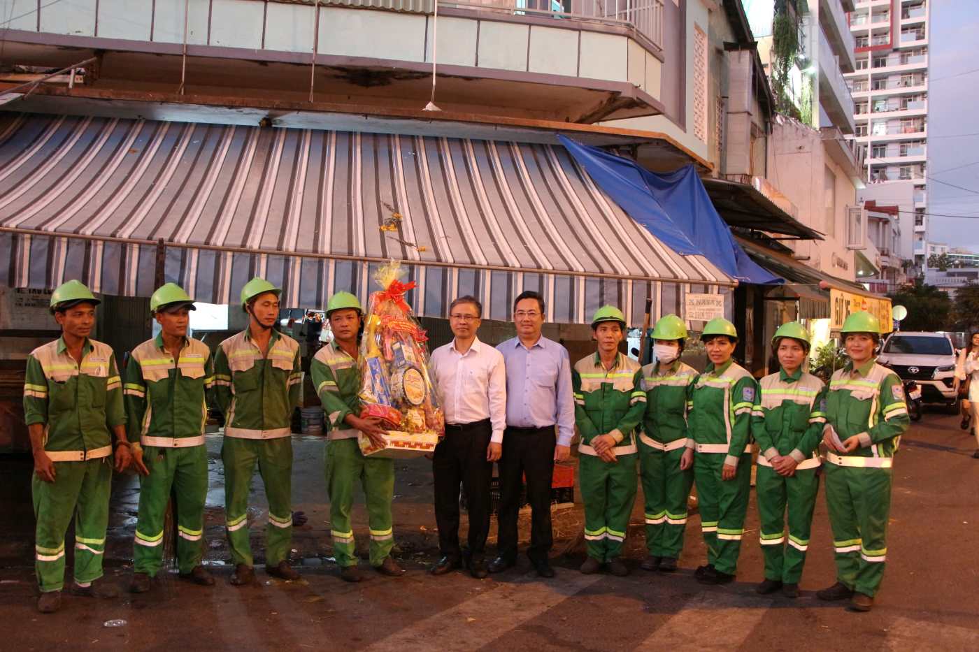 Tại Chợ Xóm Mới (phường Nha Trang), ông Trần Hòa Nam – Phó Chủ tịch UBND tỉnh Khánh Hòa đã đến thăm, chúc Tết và lì xì công nhân của Công ty Cổ phần Môi trường đô thị Nha Trang đang khẩn trương thu gom rác.