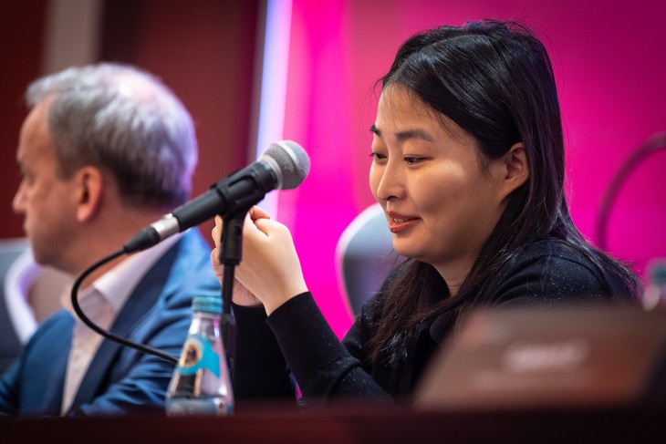 Trái ngược với vẻ điềm tĩnh của Gukesh, đương kim vô địch thế giới bảng nữ Ju Wenjun lại không giấu nổi sự phấn khích trước những vòng quay nghẹt thở của đồng hồ.