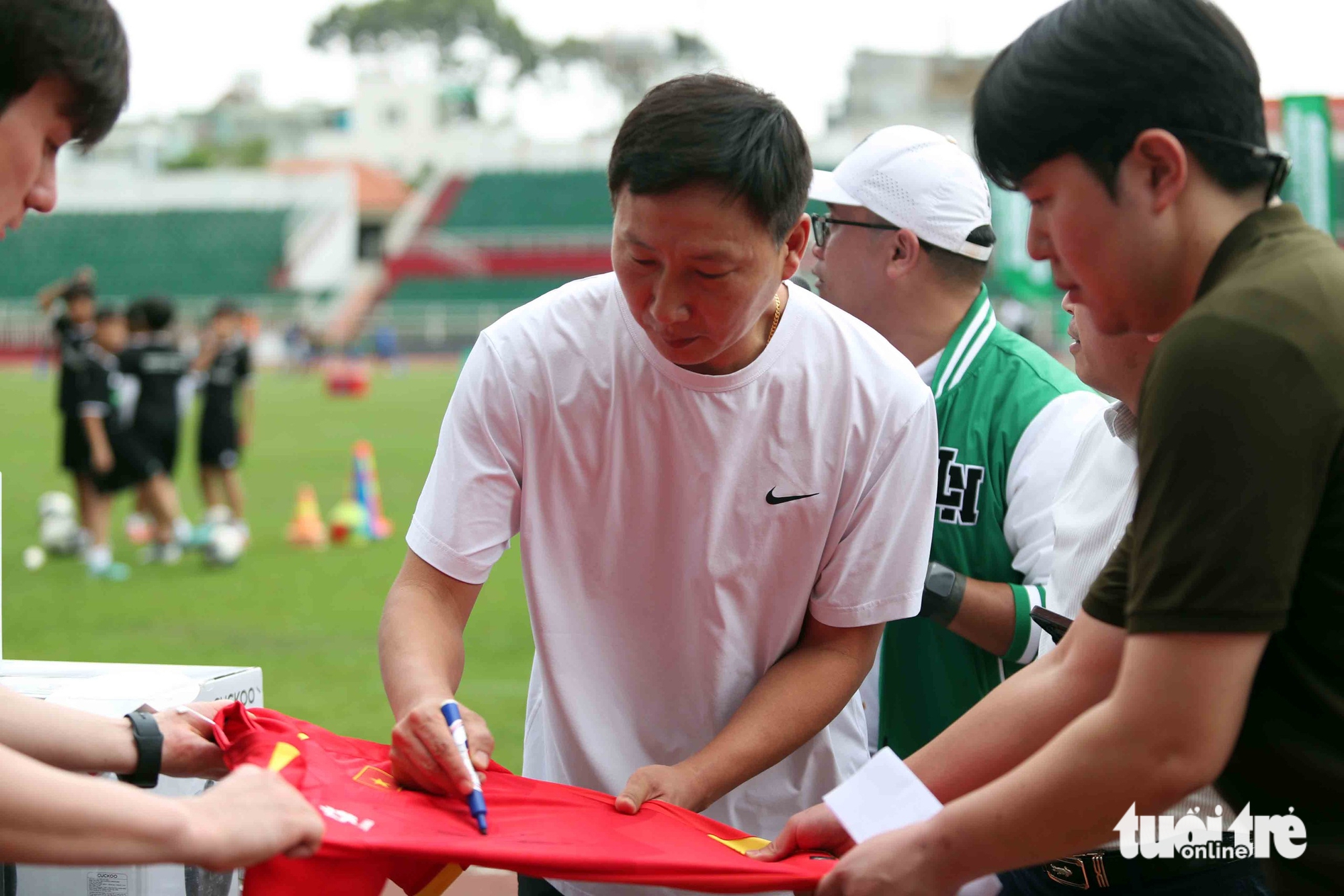HLV Kim Sang Sik cùng đội ngũ trợ lý Hàn Quốc đã khiến các cầu thủ nhí lẫn phụ huynh không khỏi hào hứng trong buổi giao lưu trên sân Thống Nhất.