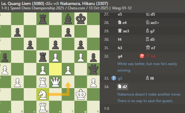 Rạng sáng 18-10, kỳ thủ Lê Quang Liêm suýt chút nữa đã có màn lội ngược dòng trước "thần chớp" Hikaru Nakamura tại giải Speed Chess Championship (SCC) 2025.