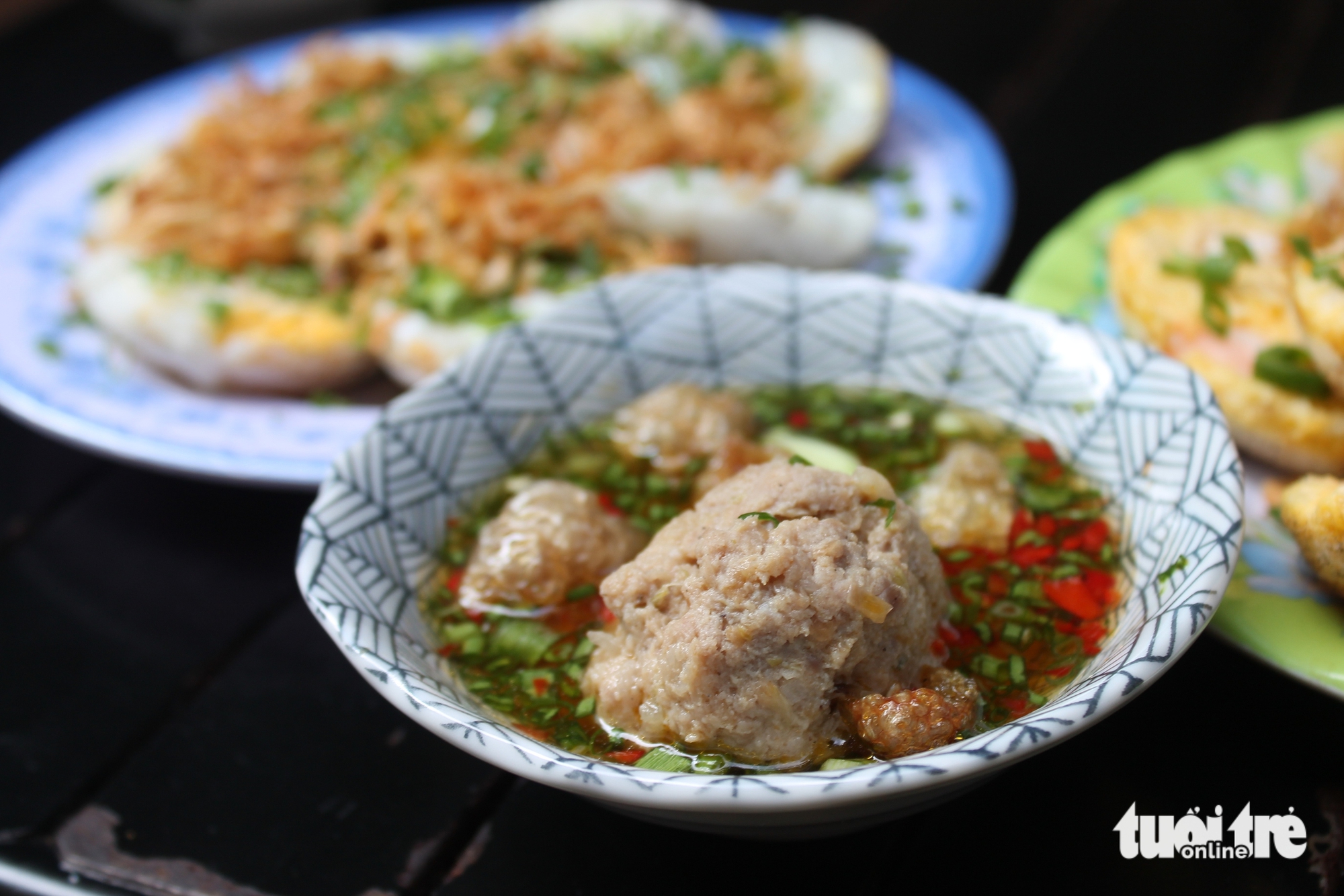 Trên nền bánh trắng ngần là màu xanh của hành lá xắt nhuyễn, màu đỏ của ớt, vị chua của xoài, chanh, tất cả hòa cùng chén mắm đặc trưng, kích thích vị giác ngay từ miếng đầu tiên.