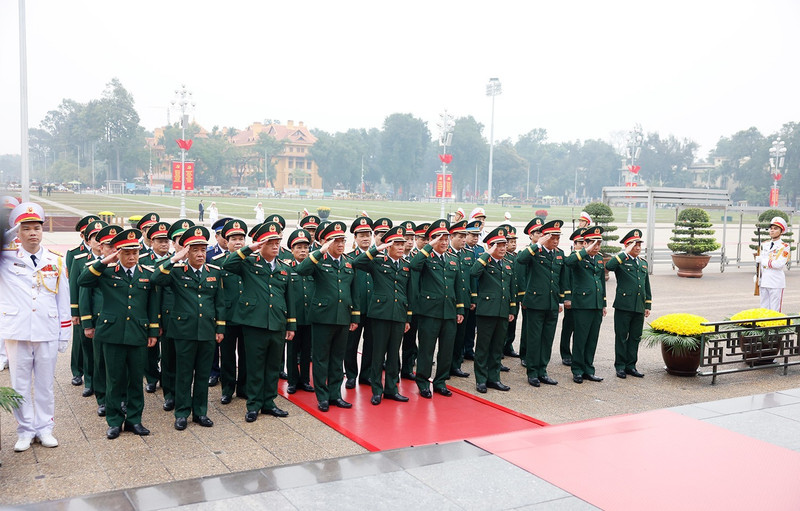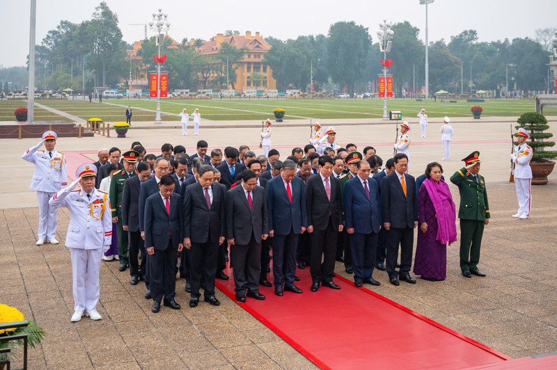 Tổng Bí thư Tô Lâm và các lãnh đạo, nguyên lãnh đạo Đảng, Nhà nước vào lăng viếng Chủ tịch Hồ Chí Minh, sáng 3/2. Ảnh: Như Ý.
