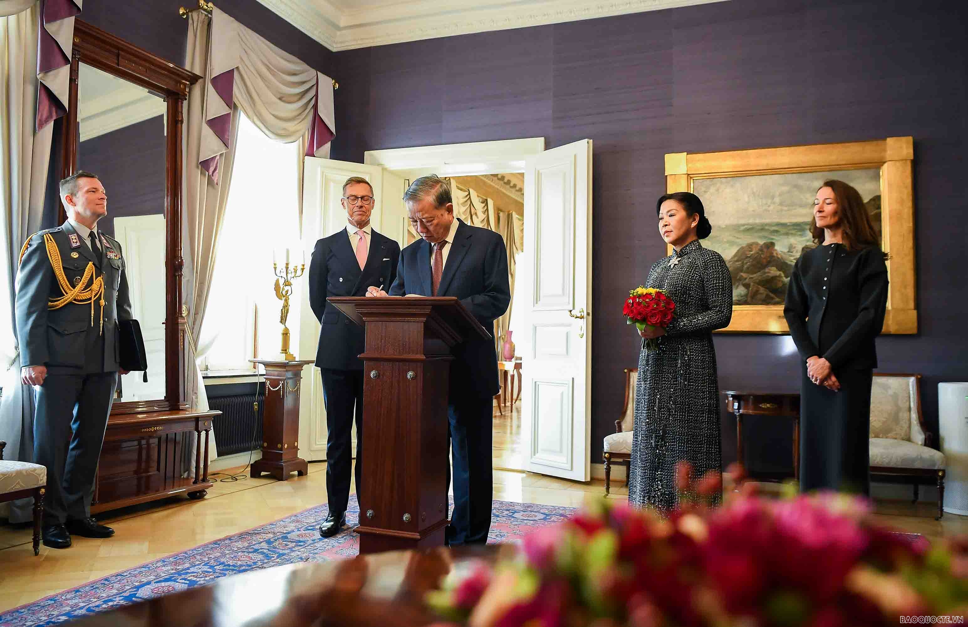 "Tôi rất vui mừng và phấn khởi đến thăm đất nước Phần Lan tươi đẹp, sáng tạo, văn hóa và nhân ái. Xin cảm ơn Ngài Tổng thống, Phu nhân và nhân dân Phần Lan đã đón tiếp trọng thị, thân tình và thiện cảm", trích lưu bút của Tổng Bí thư Tô Lâm tại Phủ Tổng thống.