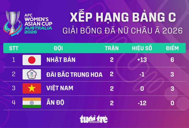 Vào lúc 16h ngày 10-3 diễn ra hai trận đấu cuối cùng của bảng C Asian Cup nữ 2026: Nhật Bản - Việt Nam và Ấn Độ - Đài Bắc Trung Hoa. Cả hai trận đấu sẽ được truyền hình trực tiếp trên hệ thống của TV360.
