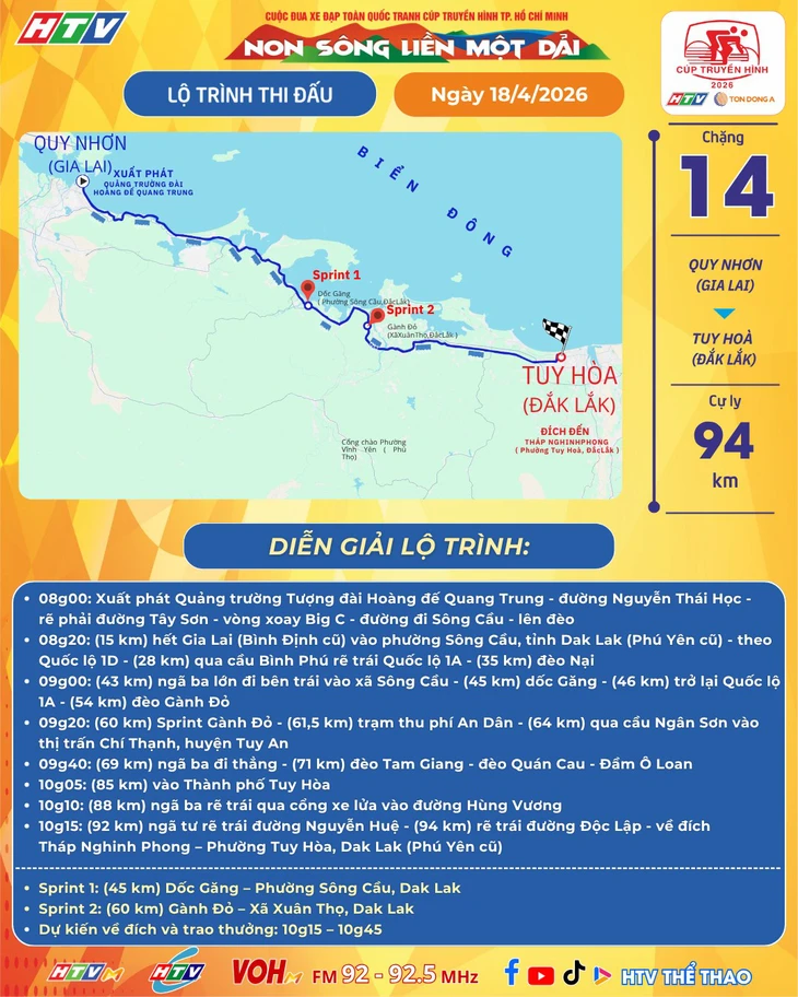Đoàn đua Cúp truyền hình TP.HCM sẽ trở lại thi đấu vào ngày 18-4. Lần này, hành trình của các cua rơ sẽ đi từ Quy Nhơn (Gia Lai) về đến Tuy Hòa (Đắk Lắk), cự ly 94km.